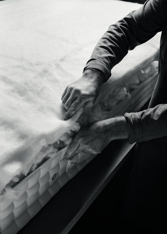 Diese einmalig bequemen Matratzen werden mit Sorgfalt und Präzision handgefertigt. Mehrere Lagen Vispring-Federn aus Vanadium-Stahl sorgen für Stützung, weiche natürliche Materialien wie feines Rosshaar hingegen für einen einzigartigen Schlafkomfort in der Nacht.